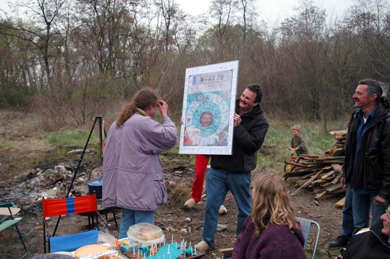 der hauptpreis war irene´s idee und bildkonzept, sloten´s bildnis innen, darüber seine nummerntafel und sein geburtsdatum und rundum seine autos, unterschrieben von uns allen: ein gerahmtes überdimensionales §57 pickerl mit einer lochung, die alle lochungen all seiner bodenplatten weitaus übertrifft.